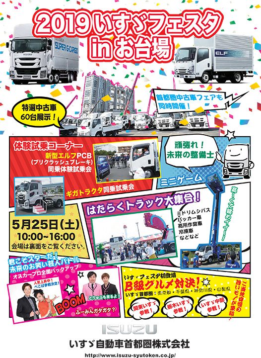 いすゞ自動車首都圏では日頃のご愛顧に感謝を込めて「2019いすゞフェスタinお台場」を開催します。